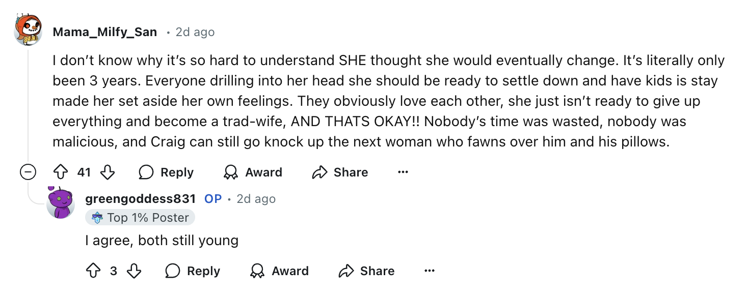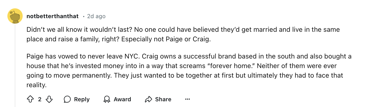 Fans have expressed their sentiments on the breakup on platforms like r/SouthernCharm Reddit. User Mama_Milfy_San commented, “I don’t know why it’s so hard to understand SHE thought she would eventually change. It’s literally only been 3 years. Everyone drilling into her head she should be ready to settle down and have kids is stay made her set aside her own feelings. They obviously love each other, she just isn’t ready to give up everything and become a trad-wife, AND THATS OKAY!! Nobody’s time was wasted, nobody was malicious, and Craig can still go knock up the next woman who fawns over him and his pillows.”